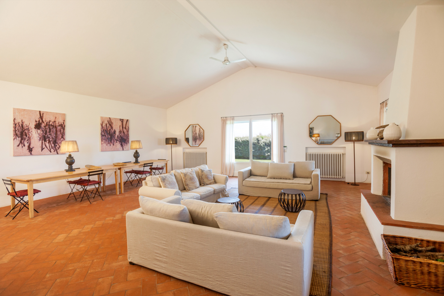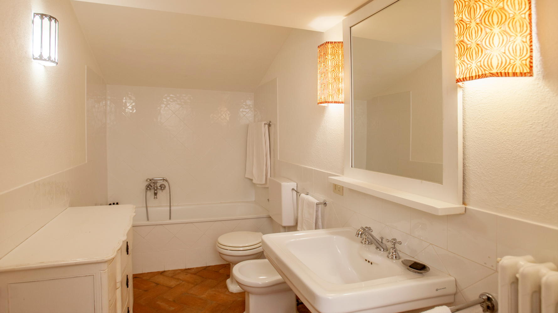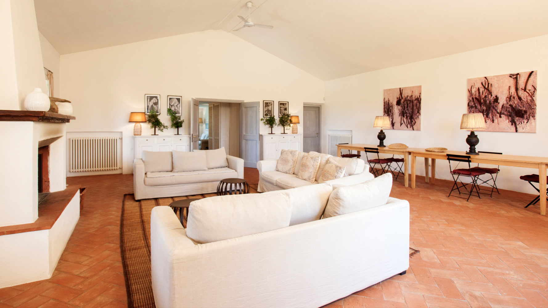 The living room has a large dining table, wide white sofas and a fireplace: you’ll notice a cast-iron wild boar in the fireplace, which is meant to protect the guests from the fire’s intense heat. The outdoor patio is covered with a stunning American vine that turns red in autumn. The patio has comfortable sofas, armchairs full of cushions and a beautiful table for lunches and dinners in the open air and where you can have a chat sipping good Tuscan wine.