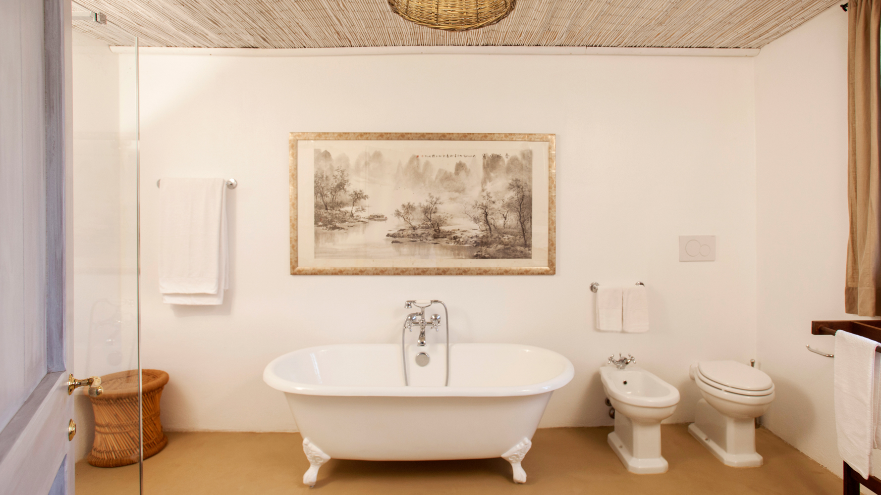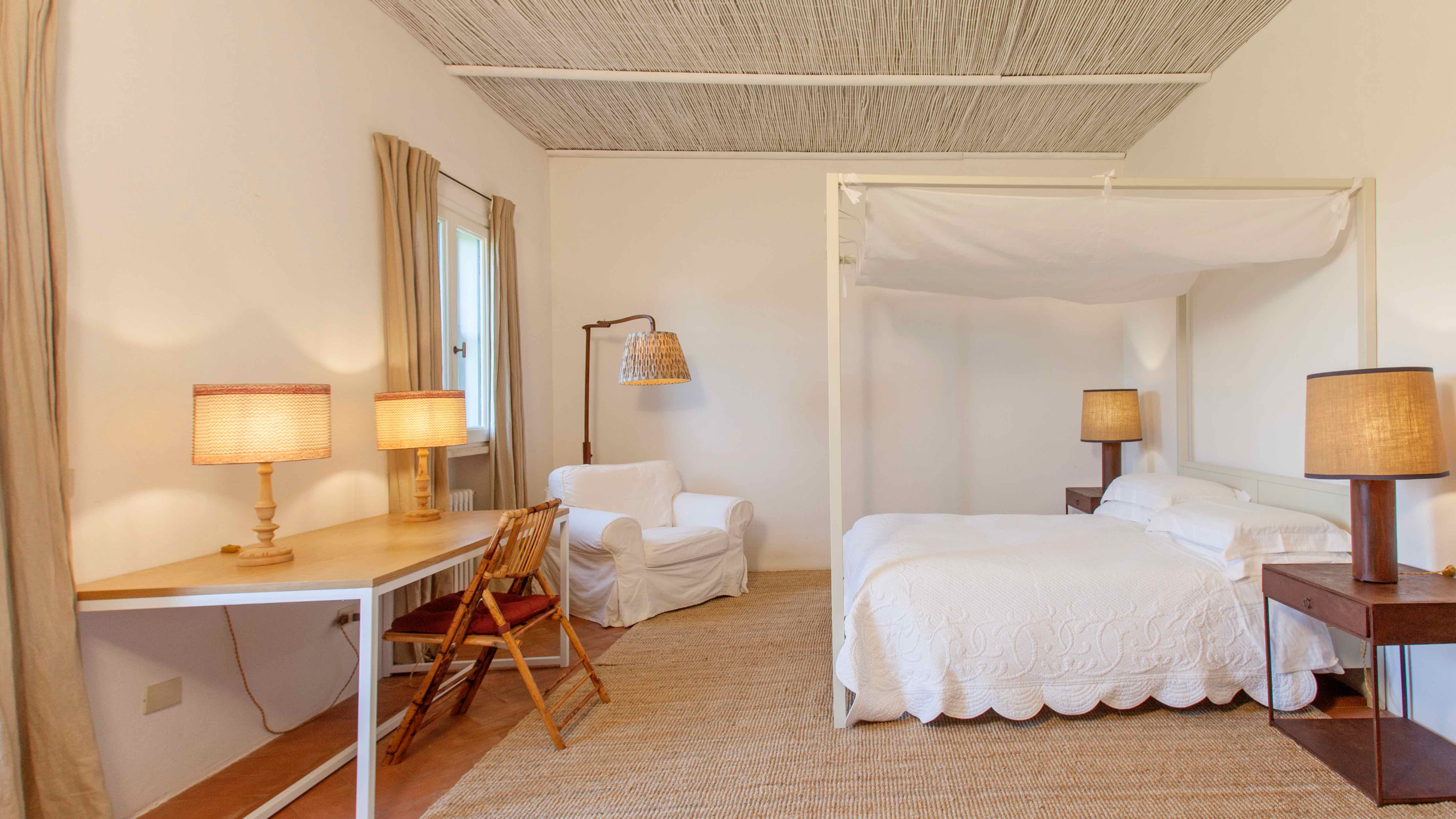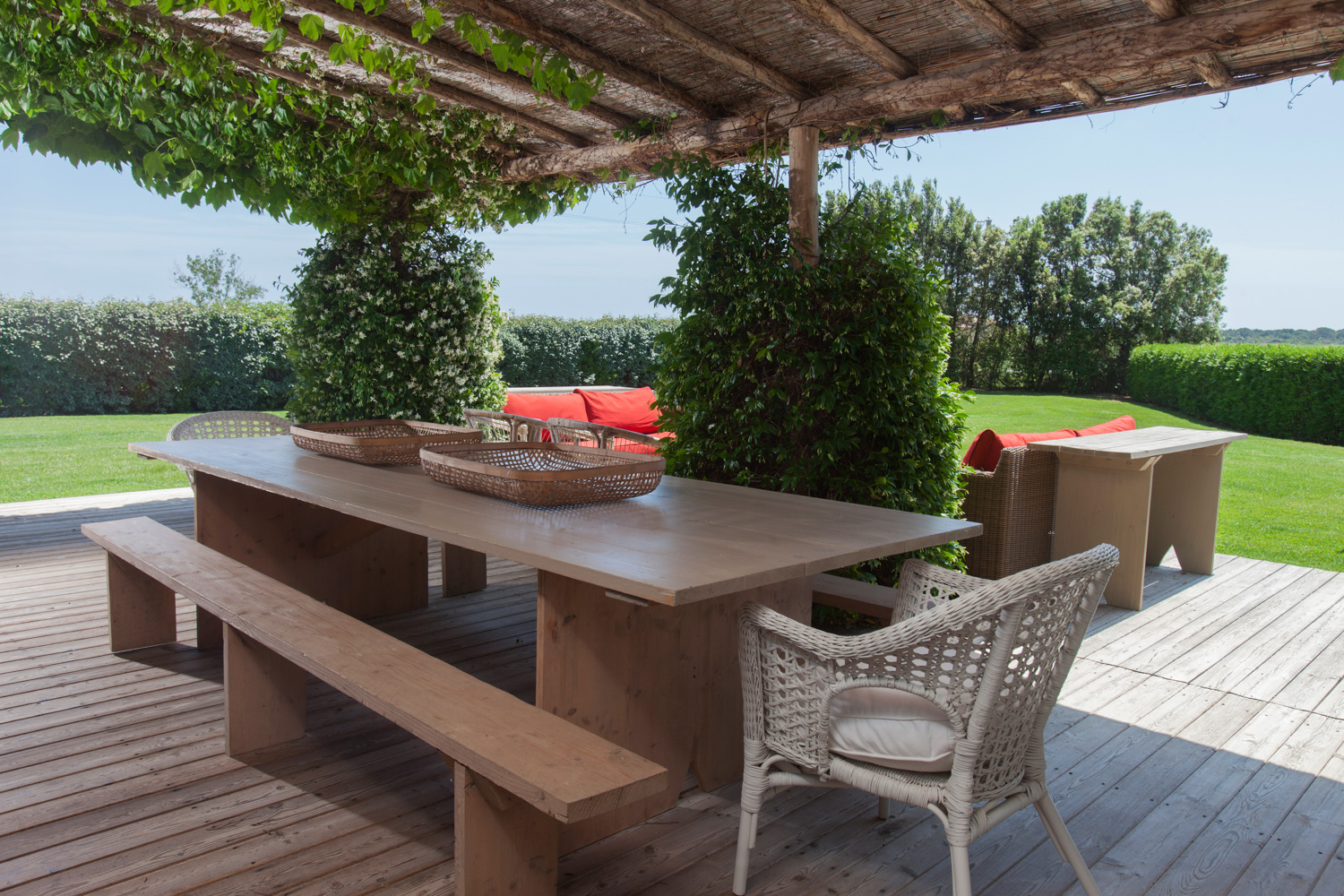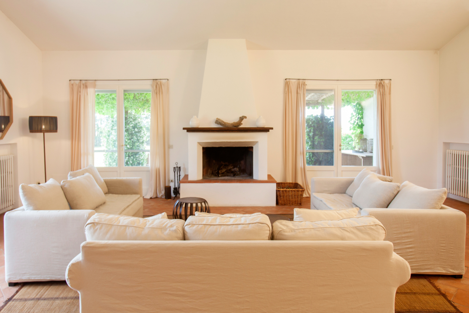 The living room has a large dining table, wide white sofas and a fireplace: you’ll notice a cast-iron wild boar in the fireplace, which is meant to protect the guests from the fire’s intense heat. The outdoor patio is covered with a stunning American vine that turns red in autumn. The patio has comfortable sofas, armchairs full of cushions and a beautiful table for lunches and dinners in the open air and where you can have a chat sipping good Tuscan wine.
