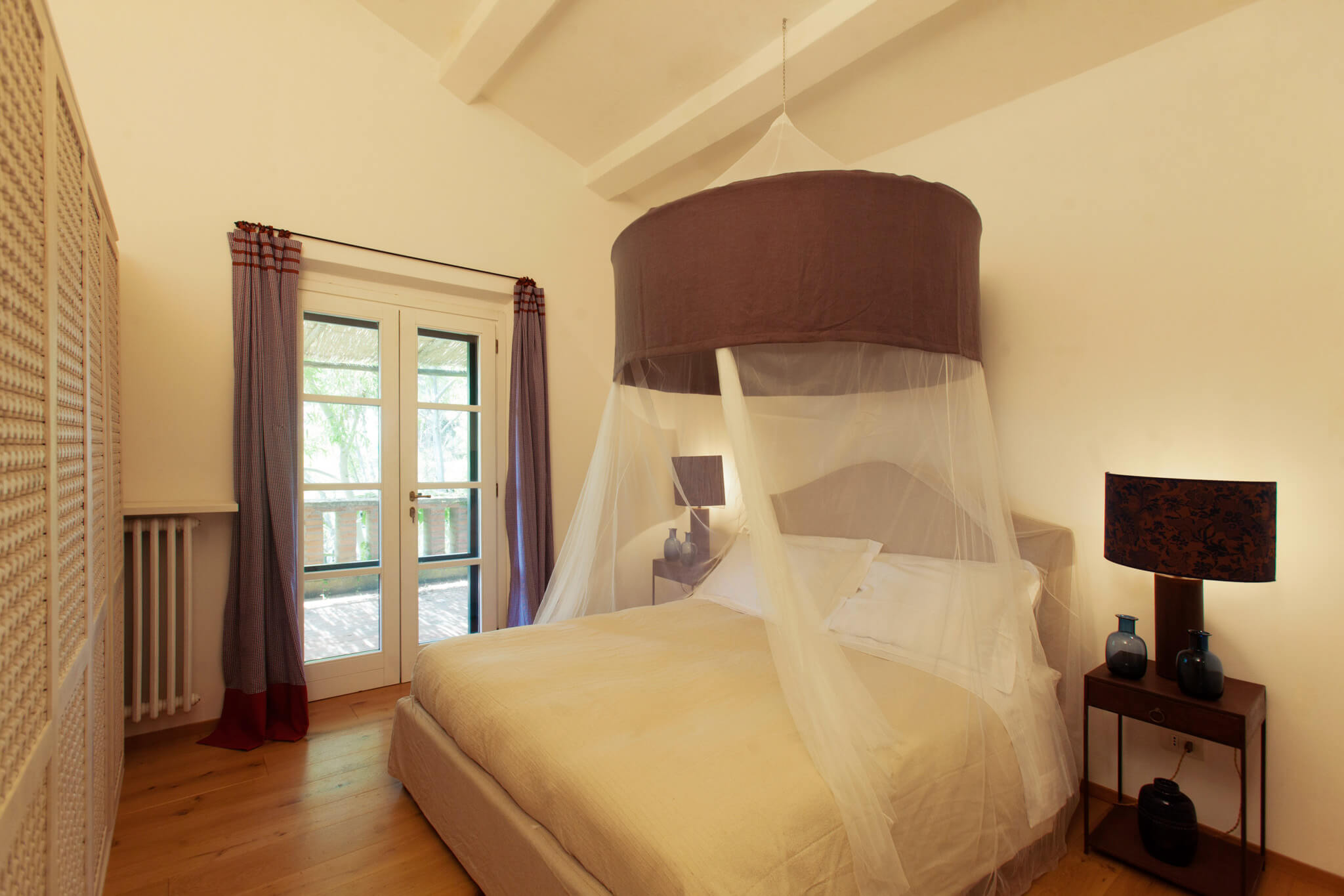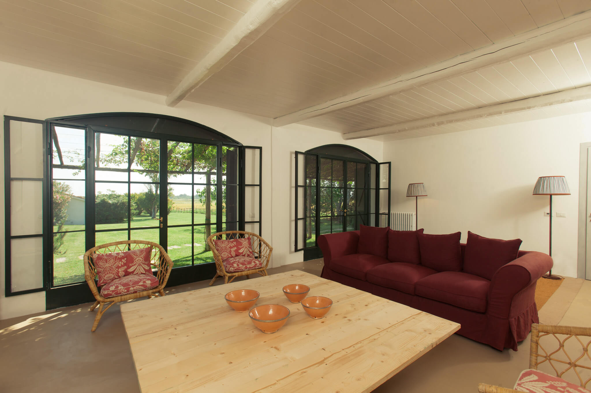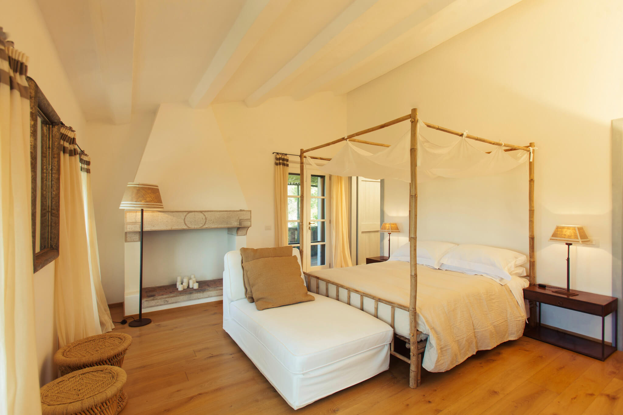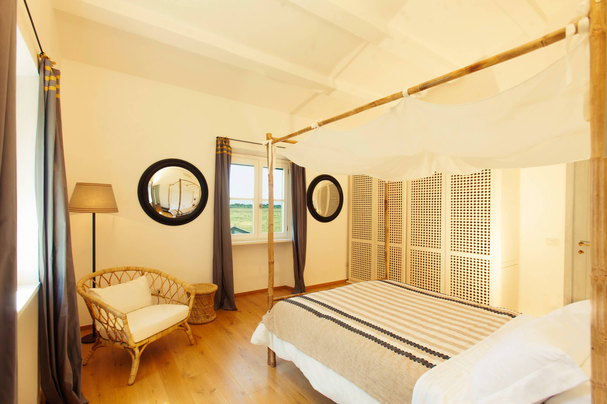 Villa dell’Eucalipto, Terre di Sacra’s feather in the cap, has been entirely renovated in 2015 and refurnished and decorated in 2018. Bamboo, straw, raw wood and terracotta are a recurring theme in the villa’s rooms. Bamboo mats, raffia lamps and terracotta plates decorate common areas. Recently, a new 25-meter-long swimming pool was completed.