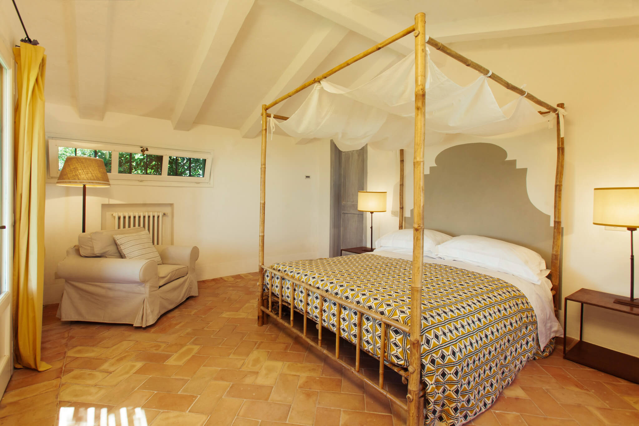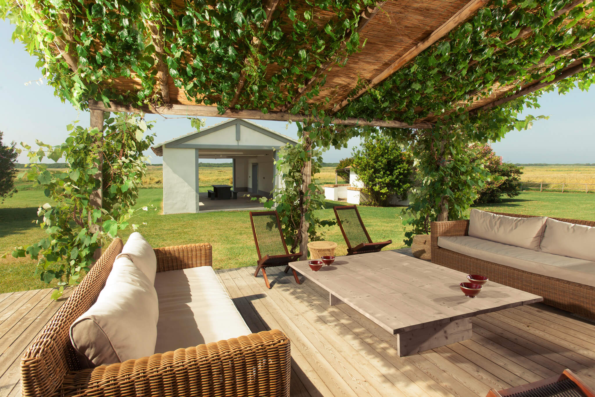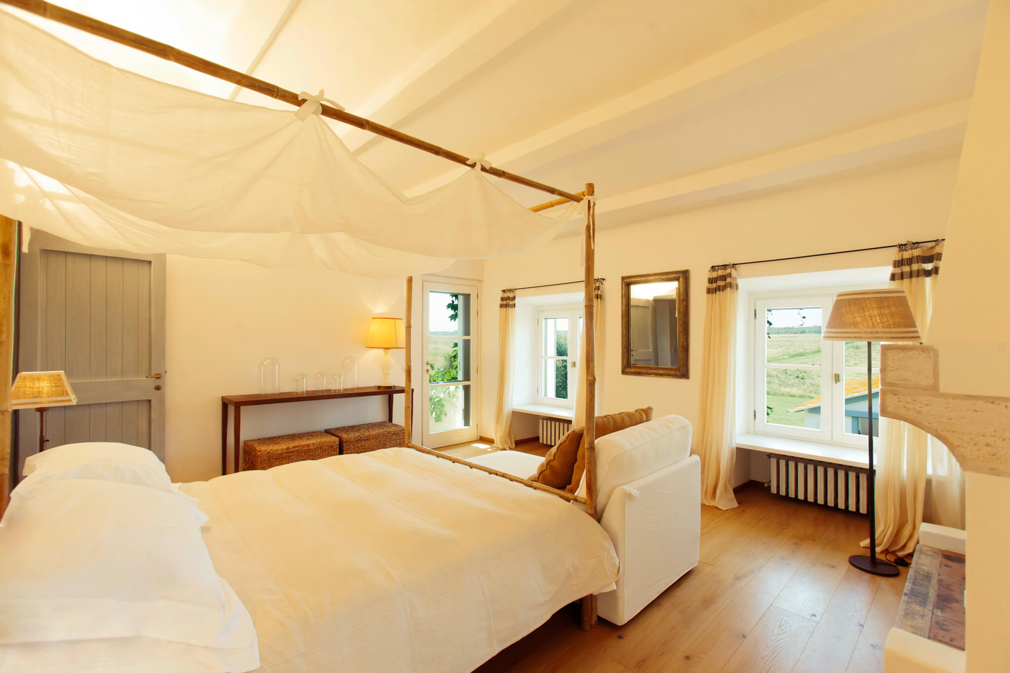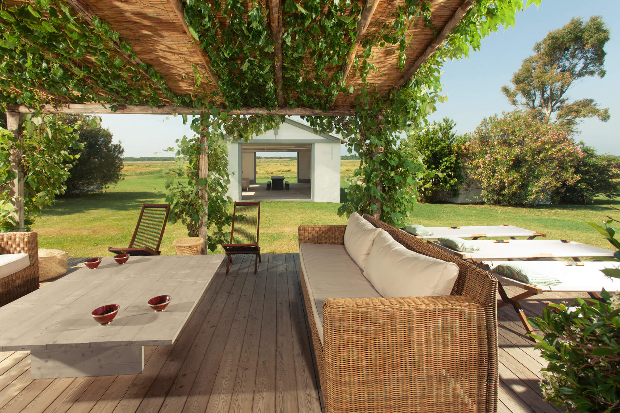 Villa dell’Eucalipto, Terre di Sacra’s feather in the cap, has been entirely renovated in 2015 and refurnished and decorated in 2018. Bamboo, straw, raw wood and terracotta are a recurring theme in the villa’s rooms. Bamboo mats, raffia lamps and terracotta plates decorate common areas. Recently, a new 25-meter-long swimming pool was completed.